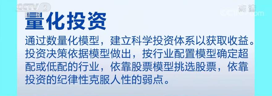 量化投资,是指通过数量化模型,建立科学投资体系以获取收益。量化投资最鲜明特征就是模型,也就是说,所有决策都是依据模型做出的。比如,按照行业配置模型确定超配或低配的行业、依靠股票模型挑选股票。每一次决策,都要通过数字程序运行模型,而不是凭感觉。这样有助于克服人性的弱点,比如投资中易犯的贪婪、恐惧、侥幸等心理。