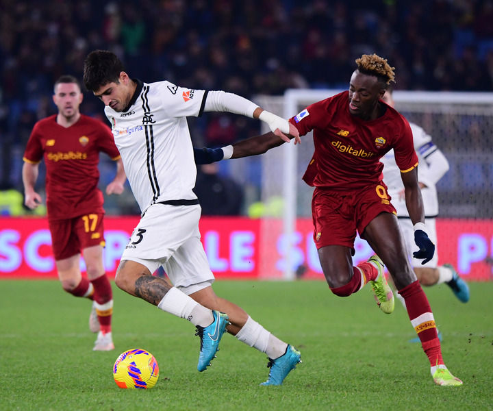12月13日,罗马队球员亚伯拉罕(右)与斯佩齐亚队球员尼古拉乌在比赛中拼抢。新华社发(阿尔贝托·林格利亚 摄)