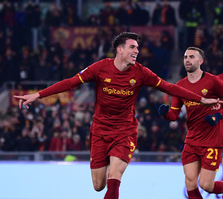 12月13日,罗马队球员伊巴涅斯(前)进球后庆祝。新华社发(阿尔贝托·林格利亚 摄)