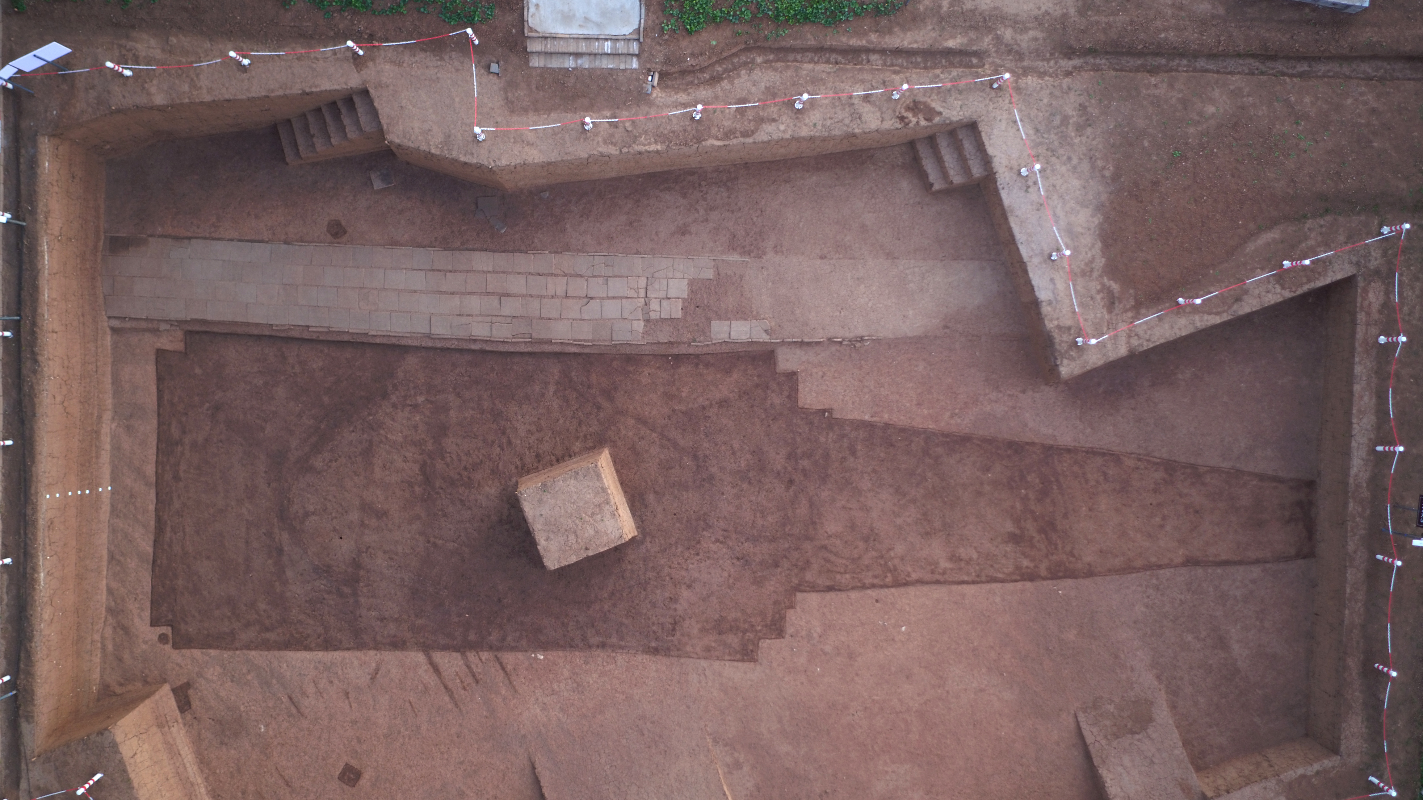 江村大墓地面无封土,墓葬形制呈“亞”字形,四面带有梯形墓道,墓室开口距地表2—4.5米,南北长74.5米,东西宽71.5米,底部距地表深27—30米。