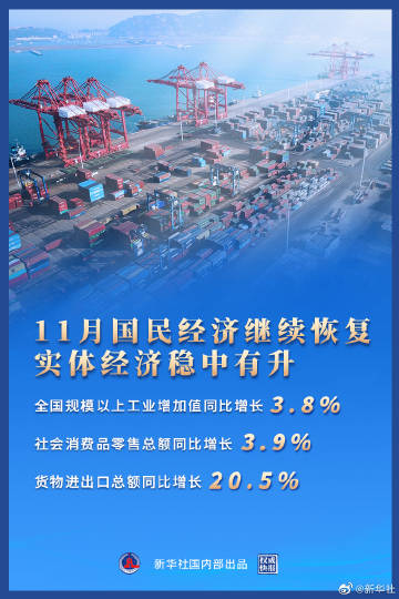 【#权威快报#|#11月国民经济继续恢复#】国家统计局15日发布的数据显示,11月份,全国规模以上工业增加值同比增长3.8%,两年平均增长5.4%;社会消费品零售总额41043亿元,同比增长3.9%,两年平均增长4.4%;货物进出口总额37164亿元,同比增长20.5%。国民经济继续保持恢复态势,发展韧性不断增强。(记者魏玉坤、邹多为,海报设计杨轶群)