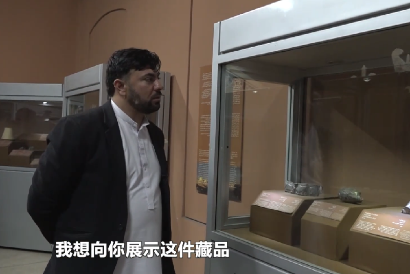 阿富汗国家博物馆馆长拉希米对新华社记者讲解阿富汗国家博物馆的重要展品。视频截图