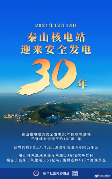 【#权威快报#|#秦山核电站安全发电30年#】2021年12月15日,位于浙江省海盐县的秦山核电站迎来安全发电30年。1991年12月15日,我国第一座自行设计、自行建造的核电站——秦山核电站并网发电,结束了我国大陆无核电的历史。我国成为世界上第七个能够自行设计建造核电站的国家。秦山核电成为安全发电30年的核电基地,已连续安全运行约140堆·年,9台机组运行业绩多年稳定处于世界先进水平。(记者高敬,海报设计杨轶群)