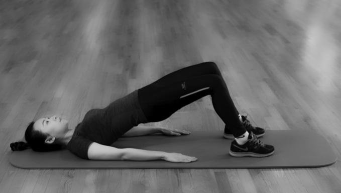 仰卧,脚掌着地,膝盖弯曲。用臀部的力量慢慢抬起骨盆,直到骨盆与脊柱在一条直线上,稍作停留后还原。重复10次。