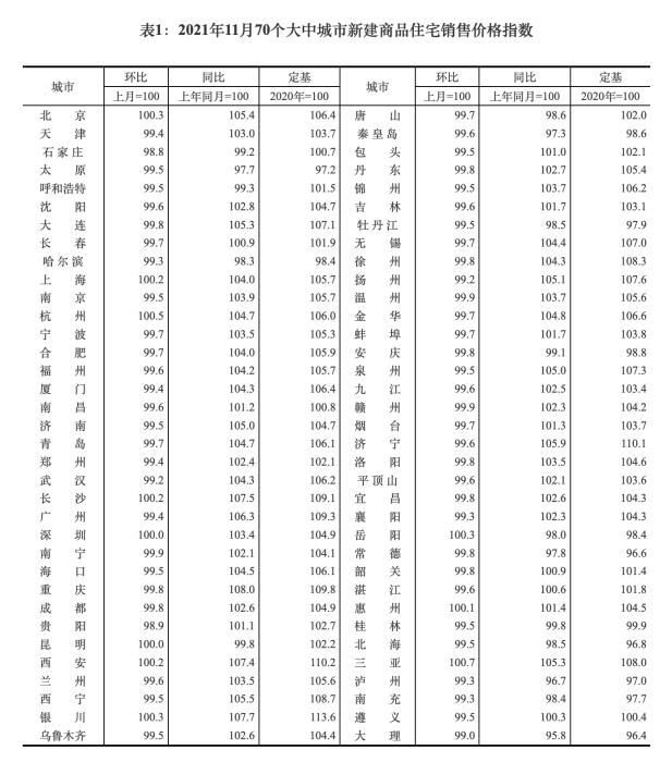 2021年11月70个大中城市新建商品住宅销售价格指数。 截图自国家统计局官网