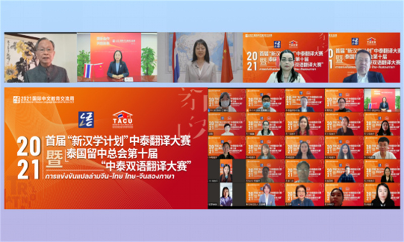 人民网曼谷12月15日电 (记者孙广勇)2021年首届“新汉学计划”中泰翻译大赛暨泰国留中总会第十届“中泰双语翻译大赛”决赛于14日成功举办,该活动是2021年国际中文教育交流周系列活动之一。前中国驻泰国大使张九桓、中外语言交流合作中心副主任静炜、中国驻泰国大使馆教育参赞冯俊英、泰国留学中国大学校友总会主席丁佩佩、中国翻译协会秘书处处长刘强出席决赛开幕式。