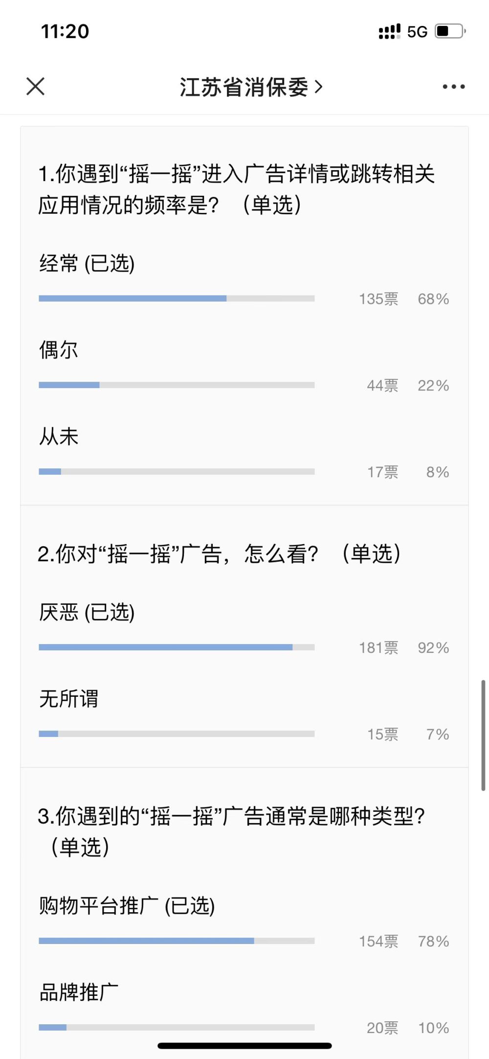 江苏省消保委官方微信公众号组织的投票调查显示,有68%的消费者经常遇到“摇一摇”开屏广告,92%的消费者对这类广告感到厌恶。