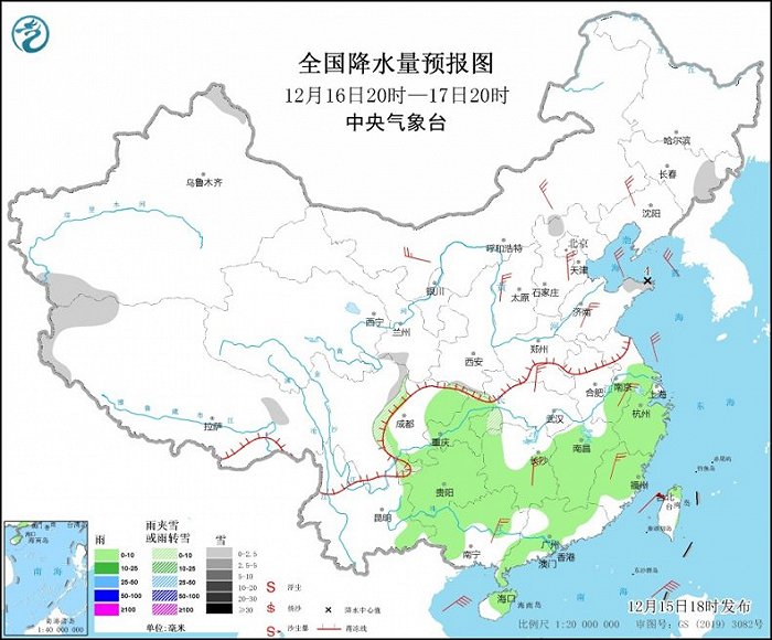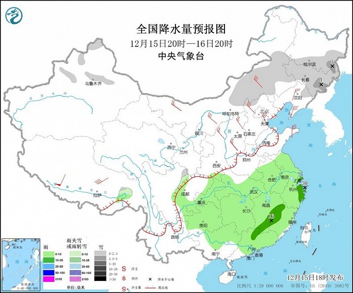 12月15日20时至16日20时,内蒙古中东部、黑龙江南部、吉林、辽宁东北部、新疆北部等地部分地区有小到中雪。黄淮南部、江淮、江汉中南部、江南、西南地区东部、华南中北部等地部分地区有小到中雨,浙江东北部等地局地有大雨(25~30毫米)。西北地区东北部、华北北部、辽宁、黄淮北部等地部分地区有4~6级风,阵风7~8级(见图3)。