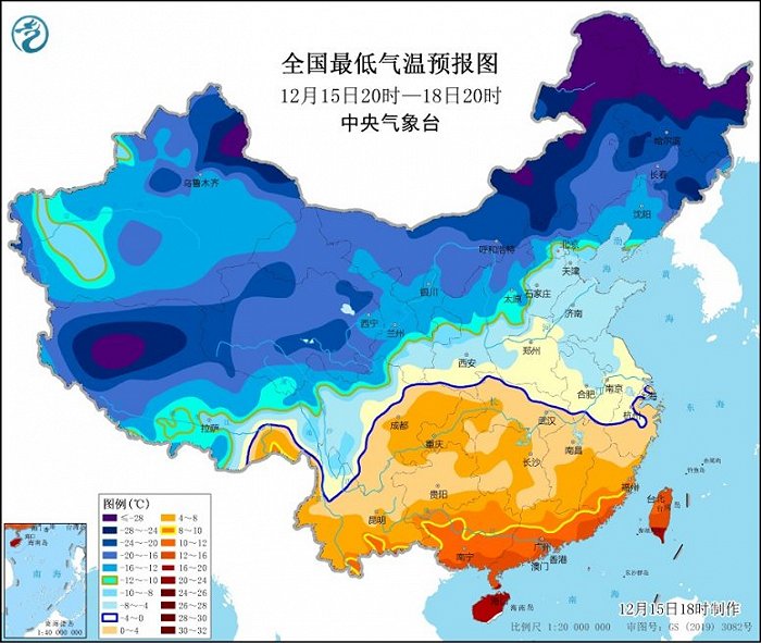 图2 全国最低气温预报图(12月15日20时-18日20时)