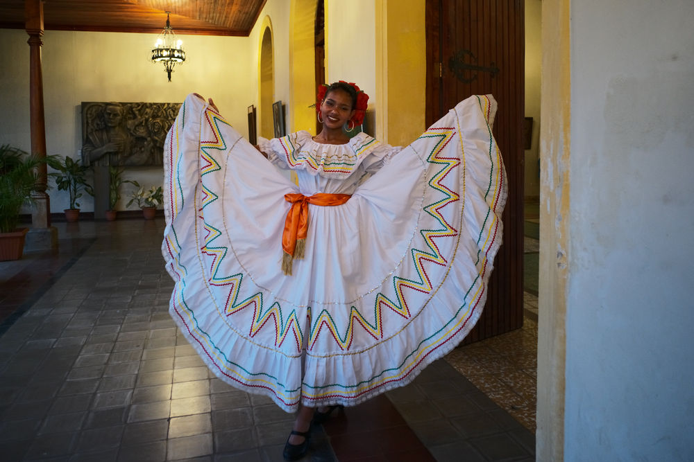 12月12日,一名演员在尼加拉瓜格拉纳达省展示该国传统服饰。(新华社记者辛悦卫摄)