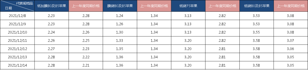 指数监测显示,截至12月14日,纸加膜80及85规格富士苹果均价为2.28元/斤,较上期上涨0.05元/斤,涨幅2.17%;膜袋80及85规格富士苹果均价为1.36元/斤,较上期上涨0.12元/公斤,涨幅9.88%;纸袋75规格富士苹果均价为3.20元/斤,较上期上涨0.07元/斤,涨幅2.13%;纸袋80及85规格富士苹果均价为3.58元/斤,较上期上涨0.05元/斤,涨幅1.42%。