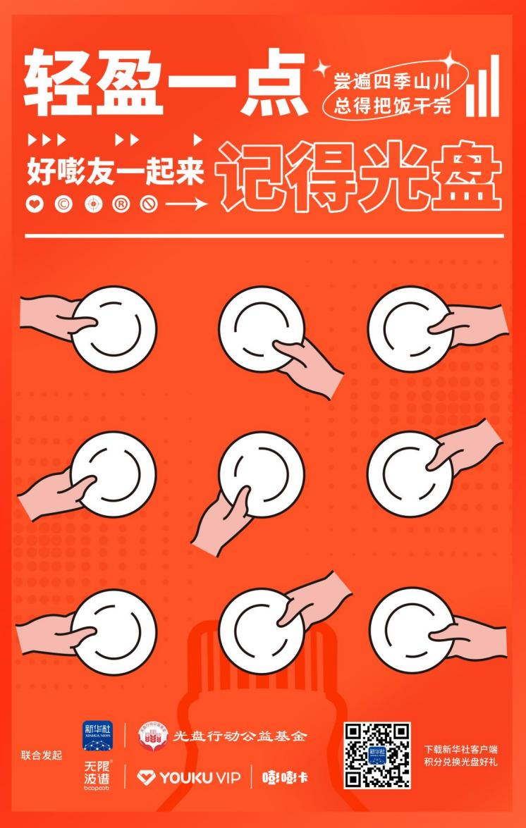 新华社客户端联合光盘行动公益基金、无限波谱、优酷VIP会员以及紫光园、鱼你在一起、西粉堂、阿上阿上、柳飘飘等众多餐饮品牌,积极响应并开展粮食节约行动,呼吁广大消费者,向餐饮浪费说“不”,争做绿色节约消费的实践者、传播者、监督者。同时鼓励引导餐饮服务经营者主动提示消费者适量点餐。
