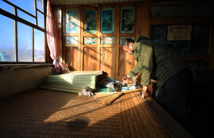 12月8日,在辽宁省大石桥市建一镇松树村,张同学在家中喂猫。