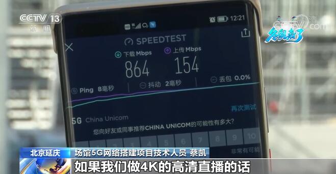 场馆5G网络搭建项目技术人员 蔡凯:我在这里现场测试一下5G现场的速率,如果做4K的高清直播,它对上行的数据要求稳定在40兆左右,现场我们看到是154兆,意味着支撑三路同时的4K高清直播是没有问题的,网络能力是具备的。