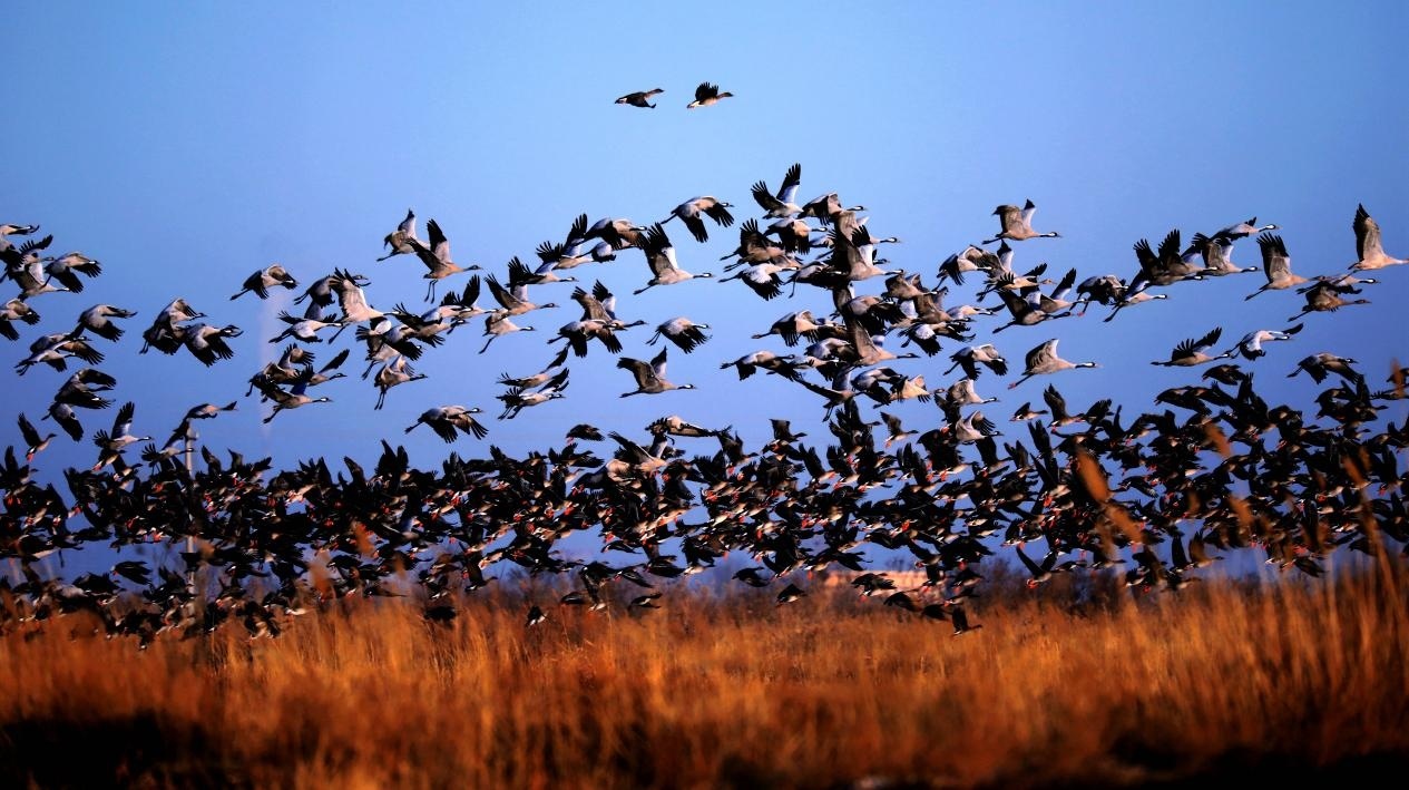 惠农区礼和乡银河湾,成群的灰鹤与豆雁蹁跹起舞。陈小组摄
