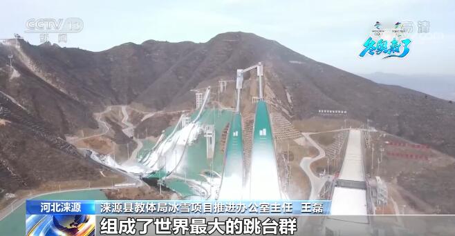 涞源县教体局冰雪项目推进办公室主任 王磊:目前涞源基地共有六个跳台,组成了世界最大的跳台群,跳台将成为四季跳台,冬季可以滑雪,其他季节可以滑草。