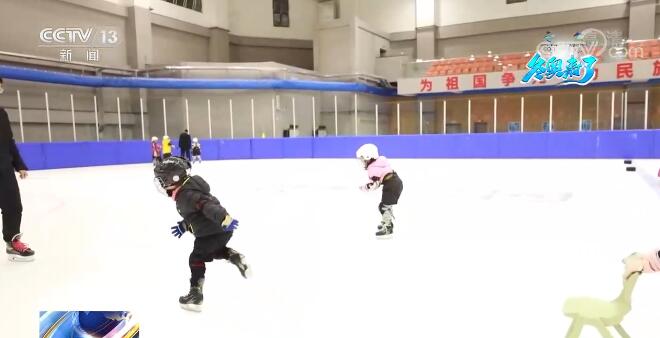 这是山东省烟台市福山区的冰上运动中心,孩子们脚踩冰刀鞋、头戴防护具,正全副武装、有模有样地跟着教练学习冰上基本动作。