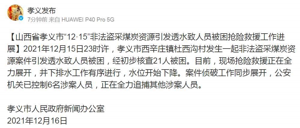 2021年12月15日23时许,山西省孝义市西辛庄镇杜西沟村发生一起非法盗采煤炭资源案件引发透水致人员被困,经初步核查21人被困。目前,现场抢险救援正在全力展开,井下排水工作有序进行,水位开始下降。案件侦破工作同步展开,公安机关已控制6名涉案人员,正在全力追捕其他涉案人员。