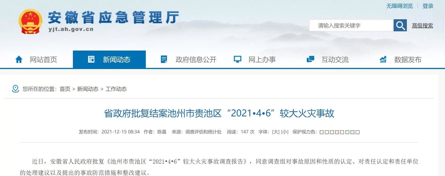 安徽省应急管理厅发布通告,12月15日,安徽省人民政府批复《池州市贵池区“2021·4·6”较大火灾事故调查报告》,同意调查组对事故原因和性质的认定、对责任认定和责任单位的处理建议以及提出的事故防范措施和整改建议。