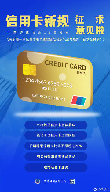 【权威快报|#信用卡新规征求意见啦#】银保监会16日发布《关于进一步促进信用卡业务规范健康发展的通知(征求意见稿)》,抓住信用卡发展中社会高度关注、群众反映集中的问题,制定针对性的监管办法。包括严格规范信用卡息费收取,银行展示分期业务资金使用成本统一采用利息形式;强化治理信用卡过度授信,防范跨行不合理叠加授信;银行长期睡眠信用卡比率不得超过20%等。(记者李延霞,海报设计张晨光)