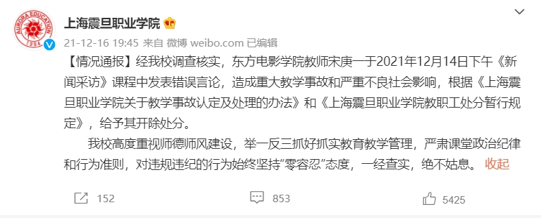 据上海震旦职业学院微博消息,经我校调查核实,东方电影学院教师宋庚一于2021年12月14日下午《新闻采访》课程中发表错误言论,造成重大教学事故和严重不良社会影响,根据《上海震旦职业学院关于教学事故认定及处理的办法》和《上海震旦职业学院教职工处分暂行规定》,给予其开除处分。