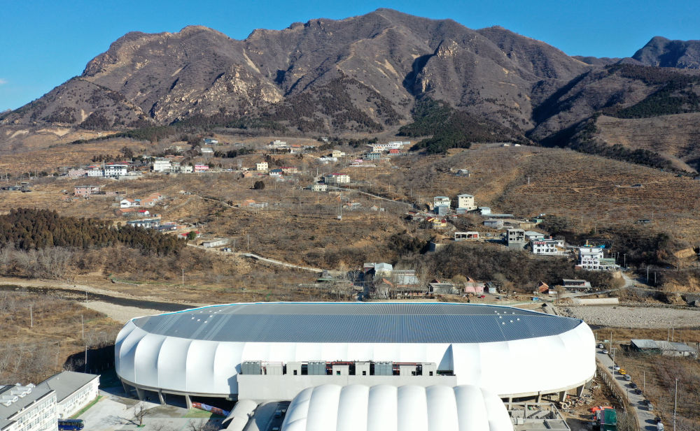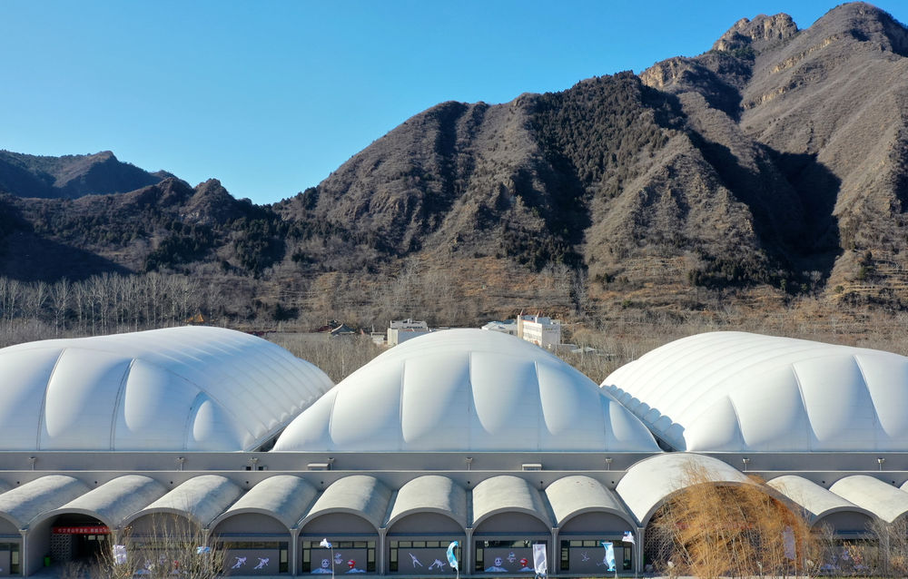 ↑这是12月16日拍摄的天津蓟州国家冰上项目训练基地速度滑冰馆外景(无人机照片)。