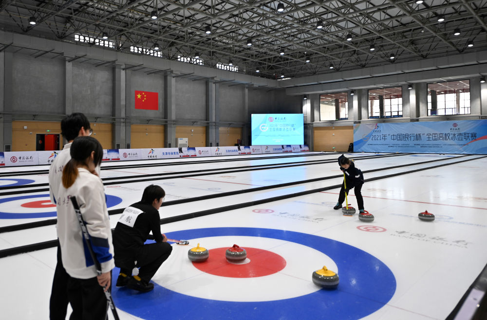 ↑12月16日,在天津蓟州国家冰上项目训练基地,参赛选手在2021年全国高校冰壶联赛中。