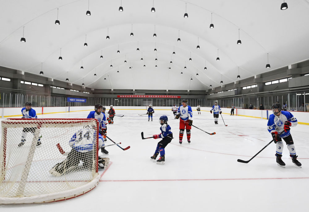 ↑这是12月16日拍摄的天津蓟州国家冰上项目训练基地冰球馆内景。