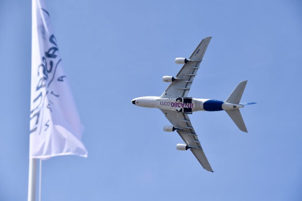 2017年6月19日,在法国巴黎近郊的布尔歇机场,空中客车公司的A380客机参加飞行展示。(新华社记者陈益宸摄)