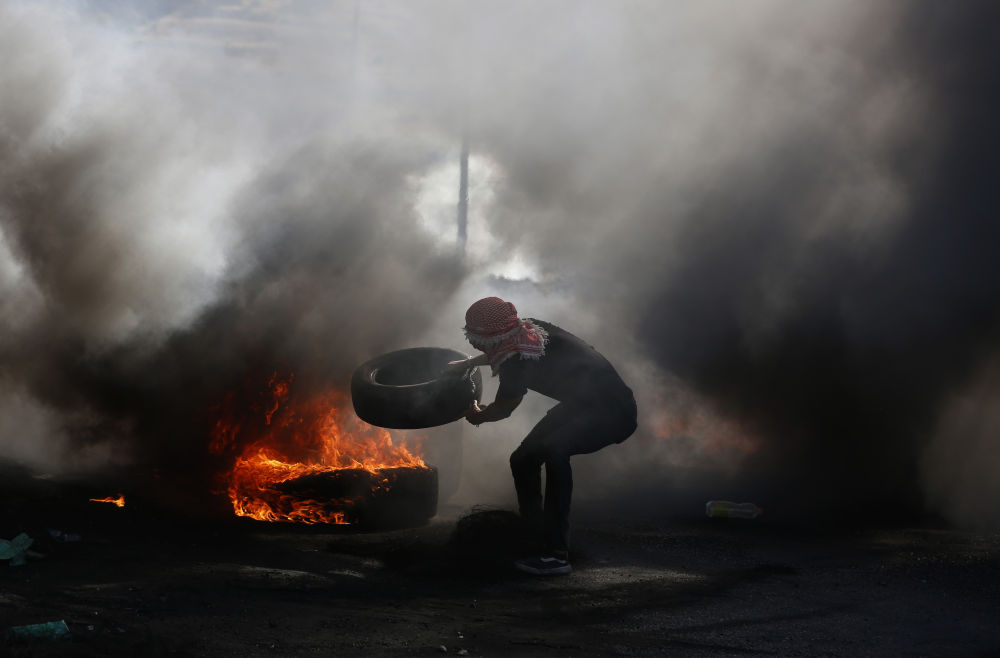 5月18日,一名巴勒斯坦示威者在约旦河西岸城市纳布卢斯附近的冲突中焚烧轮胎。新华社发(艾曼·诺巴尼摄)