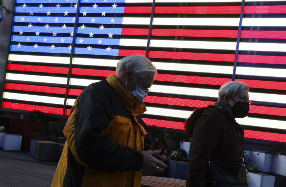 12月13日,戴口罩的行人走在美国纽约时报广场。美国约翰斯·霍普金斯大学13日发布的新冠疫情最新统计数据显示,美国累计确诊病例超过5000万例。(新华社记者王迎摄)
