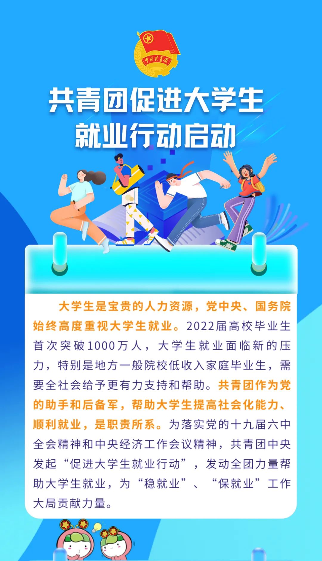 为贯彻落实党的十九届六中全会精神和中央经济工作会议精神,抓好重点群体就业,落实落细稳就业举措,近日,共青团中央启动促进大学生就业行动。