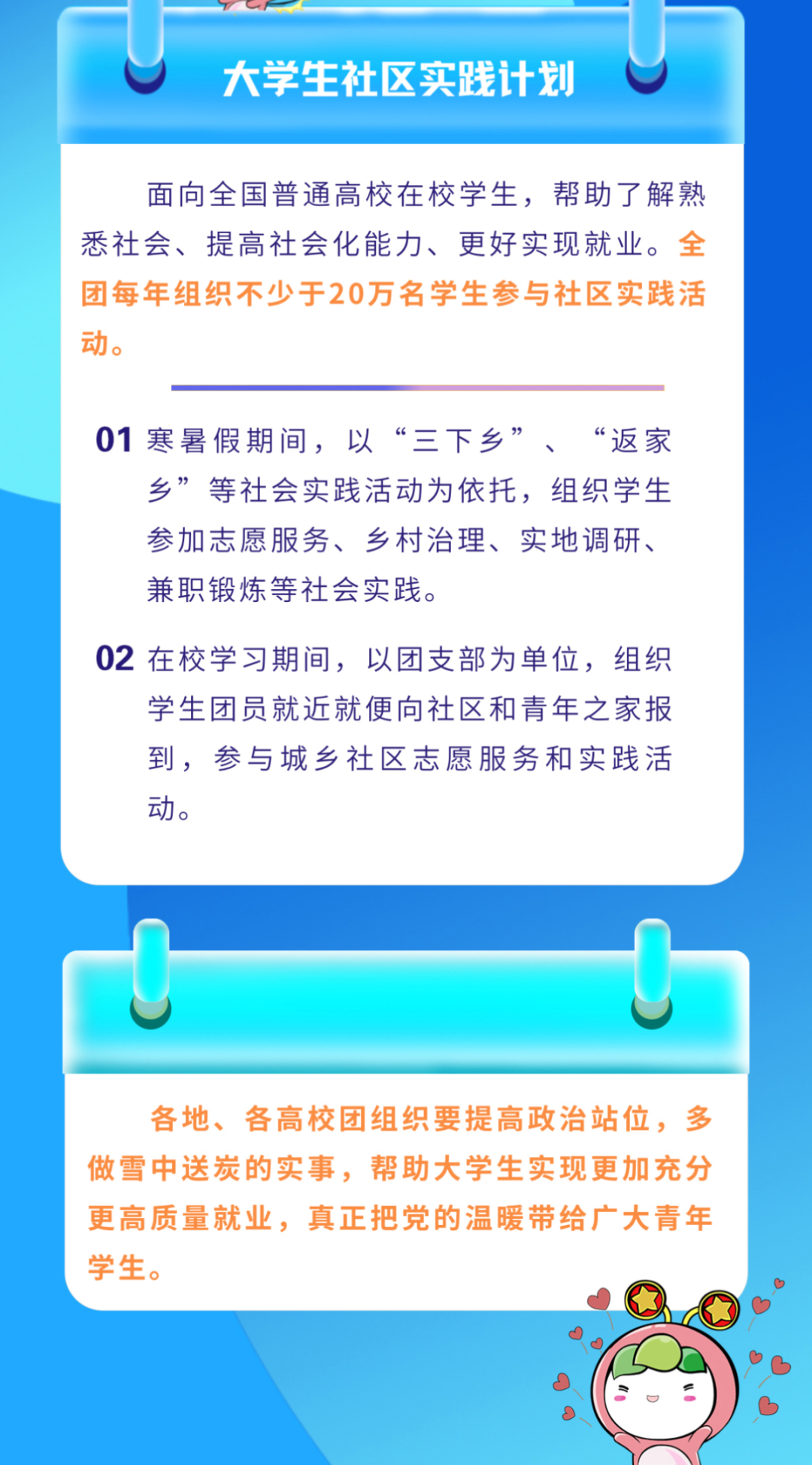 面向全国普通高校在校学生,实施大学生社区实践计划,每年组织不少于20万大学生在寒暑假期间开展“返家乡”等社会实践活动、日常向社区和青年之家报到,帮助在校大学生了解熟悉社会、提高社会化能力、更好实现就业。