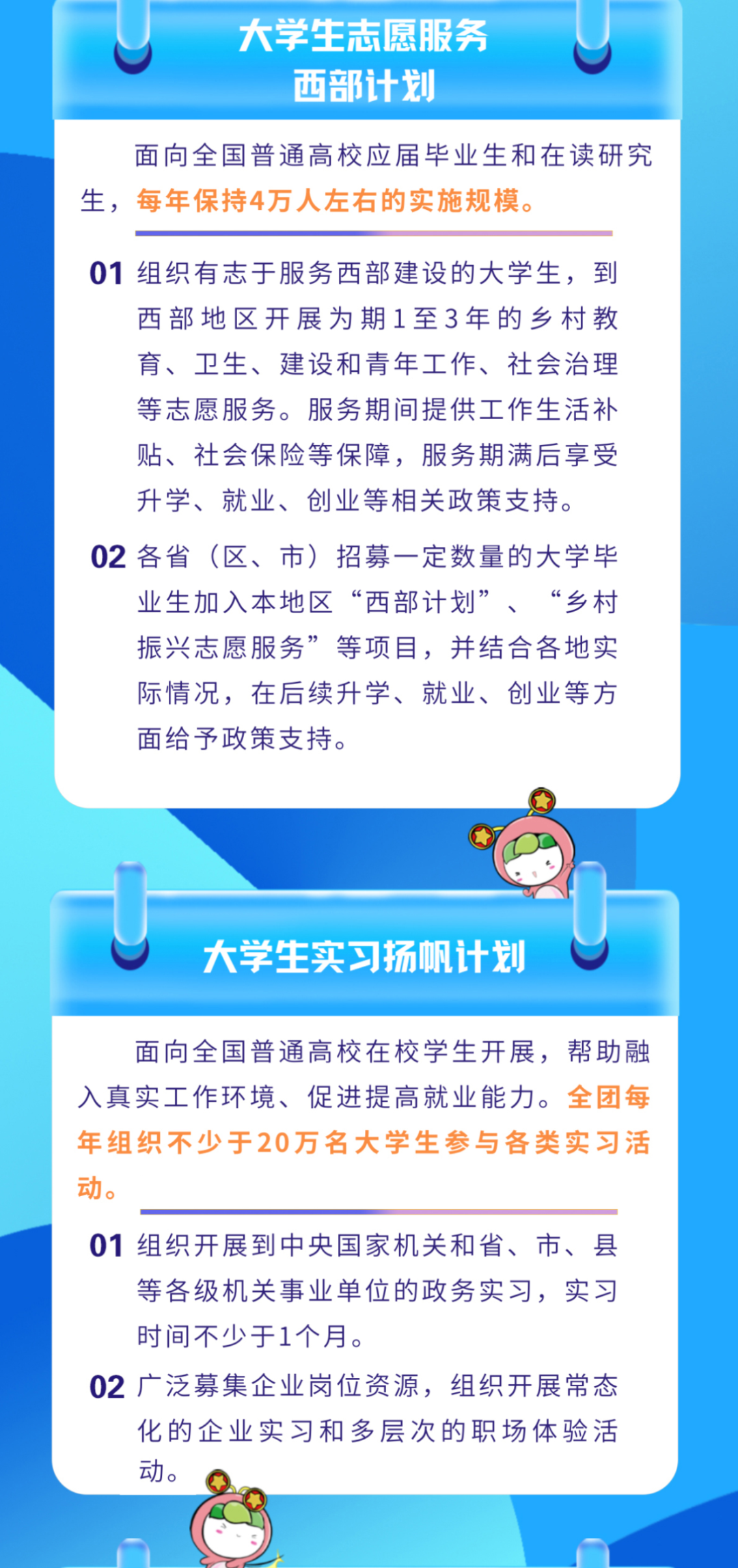 面向全国普通高校应届毕业生和在读研究生,实施大学生志愿服务西部计划,赴基层开展为期1至3年的乡村教育、卫生、建设和青年工作、社会治理等志愿服务,并结合实际在后续升学、就业、创业等方面给予政策支持,每年保持4万人左右的实施规模;