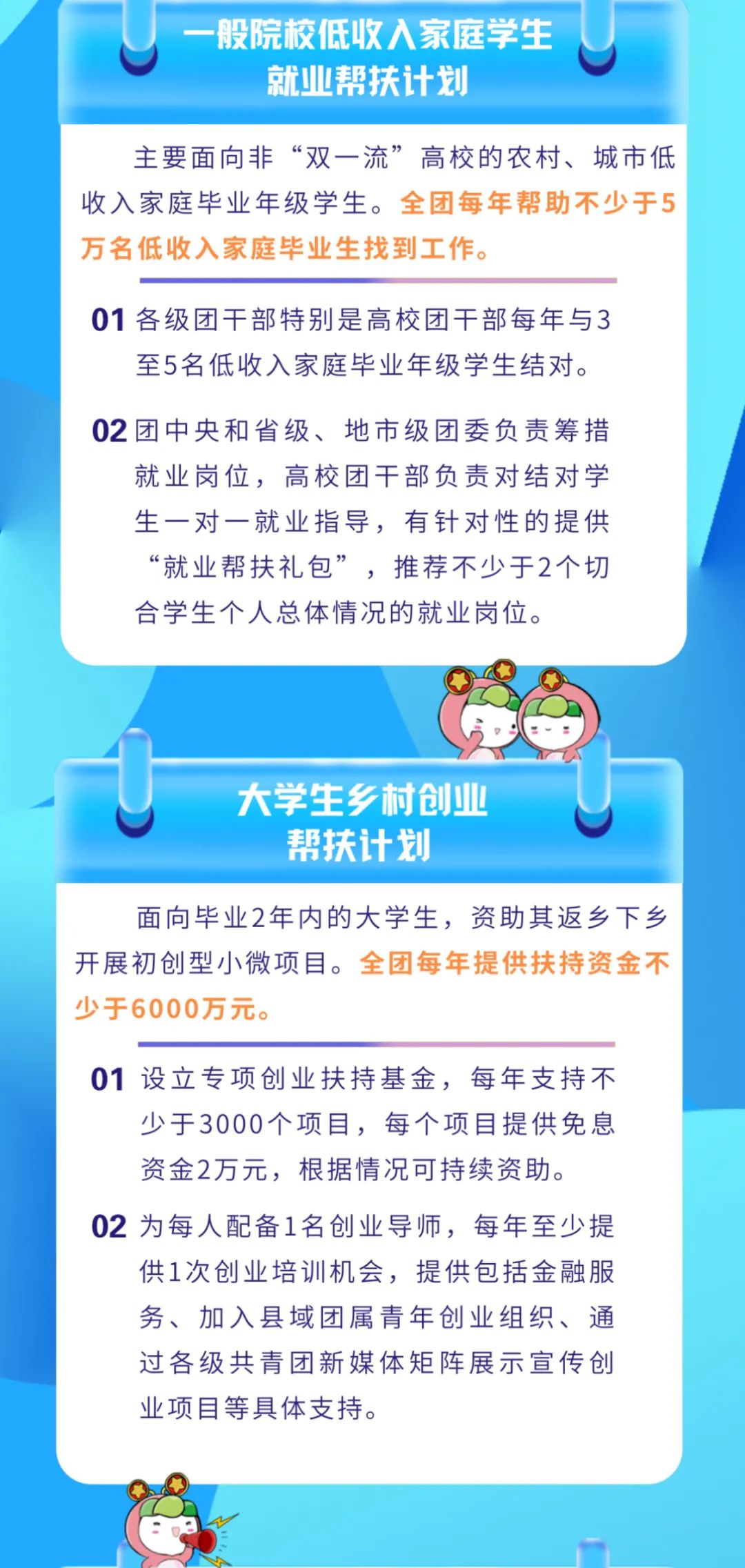 面向非“双一流”高校的农村、城市低收入家庭毕业年级学生,实施一般院校低收入家庭学生就业帮扶计划,组织各级团干部特别是高校团干部,每年与3至5名学生结对,提供一对一就业指导,推荐不少于2个切合学生个人总体情况的就业岗位,每年帮助不少于5万名学生找到工作;