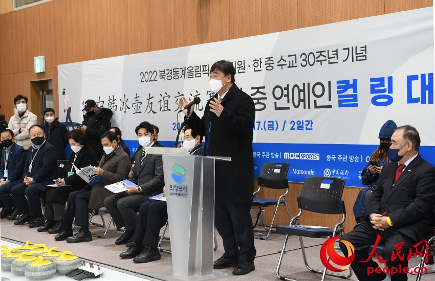人民网首尔12月17日电(周玉波、杨帆)为迎接北京冬奥会、纪念中韩建交30周年,在北京冬奥会倒计时50天来临之际,中国驻韩国大使馆携手韩国体育文化观光部、京畿道议政府市等共同主办的中韩冰壶友谊交流赛于16日在韩开幕。本次比赛为期两天,由中韩两国体育界、文艺界的友好人士组成的4支参赛队伍进行了较量。