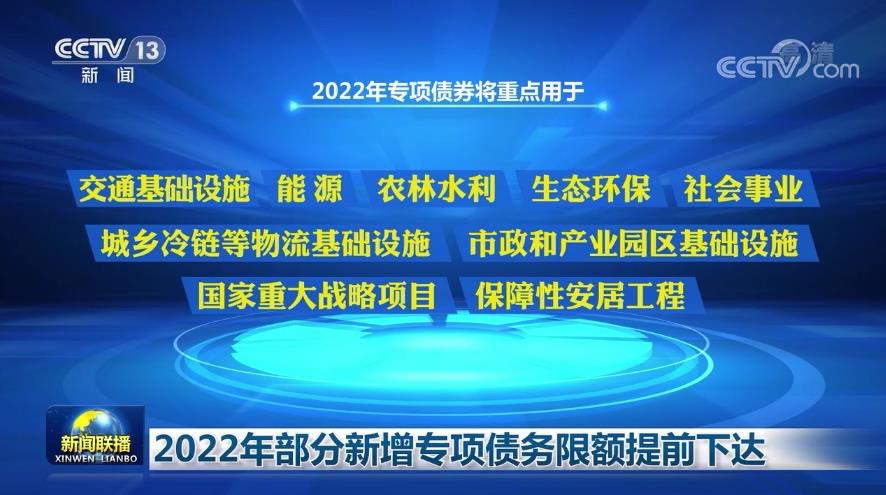 据了解,2022年专项债券除聚焦经济社会发展短板领域以外,将重点用于交通基础设施、能源、农林水利、生态环保、社会事业、城乡冷链等物流基础设施、市政和产业园区基础设施以及国家重大战略项目和保障性安居工程等9个方向。同时,还将优先支持纳入国家“十四五”规划《纲要》的项目,积极发挥专项债券对重大规划和战略的支撑作用,为稳定宏观经济大盘提供有力支撑。