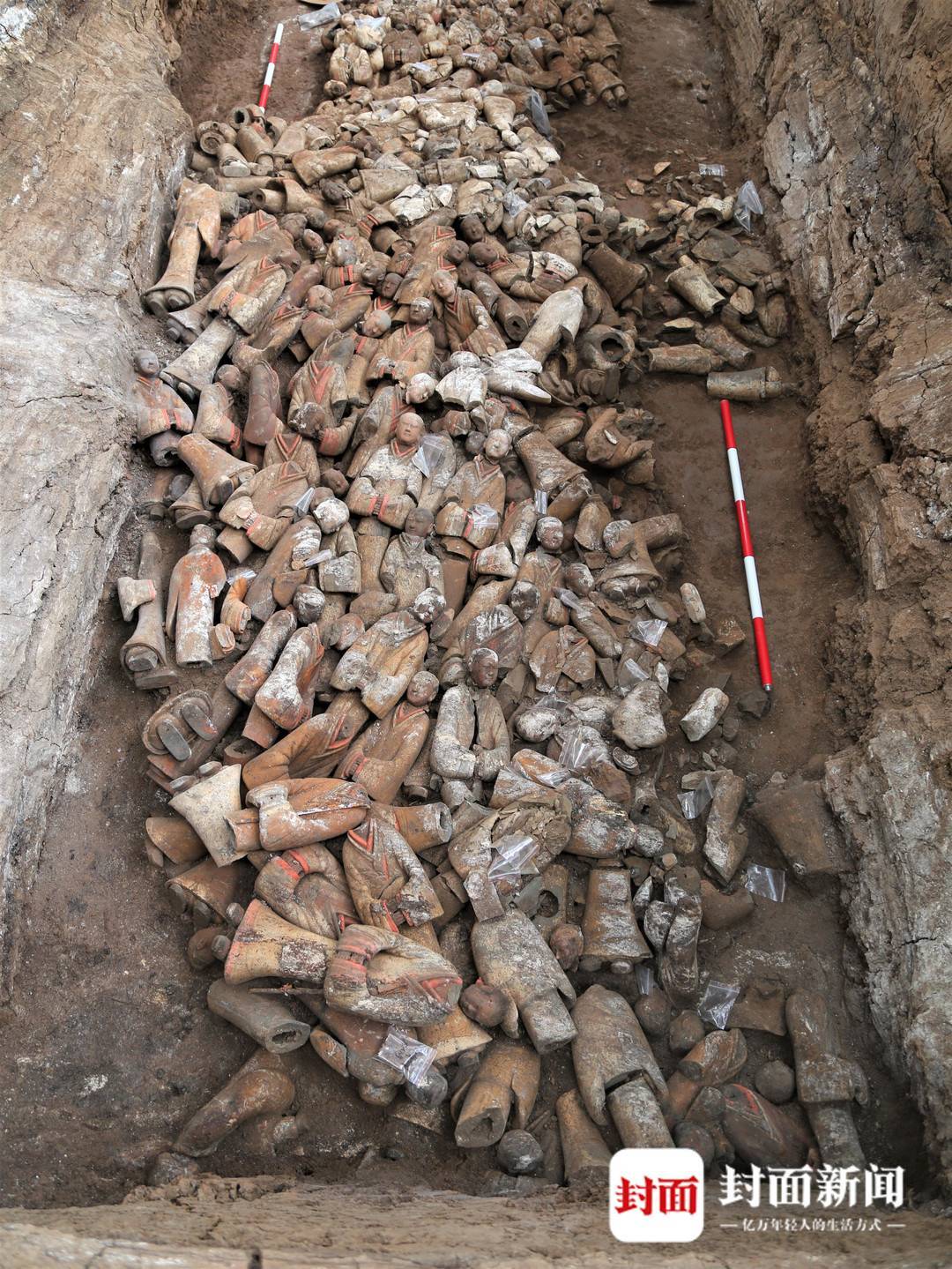 12月16日,封面新闻记者跟随曹龙走进江村大墓外藏坑1号发掘点的15号坑,目睹了数以千计的”着衣俑“,还有一些编钟、石磬的残片,汉文帝这位以清廉孝顺著称的皇帝,从霸陵位置及陪葬物的选择中可以一窥端倪。