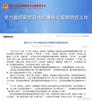截至12月17日24时,据31个省(自治区、直辖市)和新疆生产建设兵团报告,现有确诊病例1648例(其中重症病例6例),累计治愈出院病例93917例,累计死亡病例4636例,累计报告确诊病例100201例,现有疑似病例6例。累计追踪到密切接触者1380114人,尚在医学观察的密切接触者48517人。