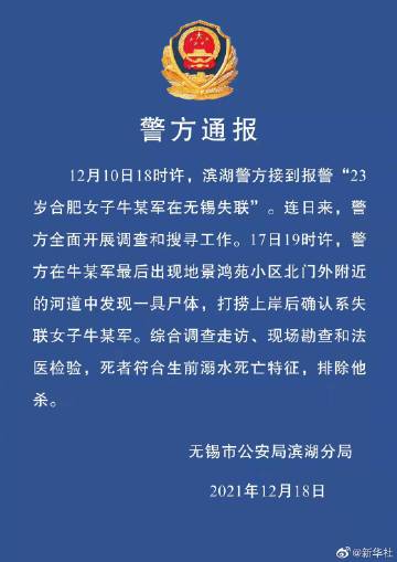 【#无锡失联女子排除他杀#】江苏省无锡市公安局滨湖分局18日通报,经综合调查走访、现场勘查和法医检验,17日晚找到的失联8天女子牛某军符合生前溺水死亡特征,排除他杀。