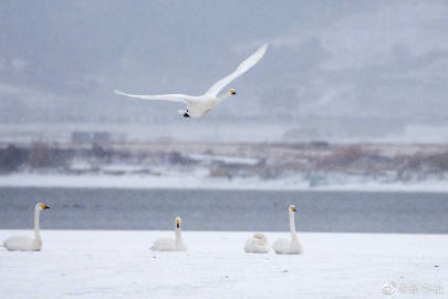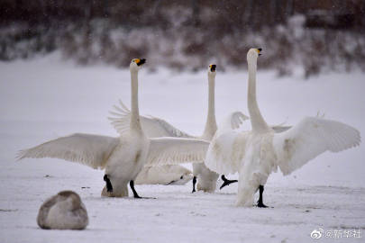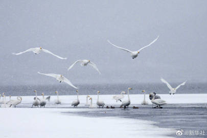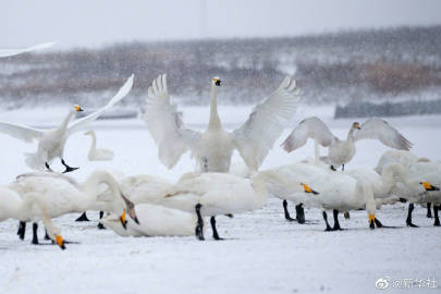 【#山东荣成冰雪天鹅湖#】 12月17日,在山东荣成大天鹅国家级自然保护区天鹅湖,大天鹅在冰雪中嬉戏。当日,山东荣成迎来降雪,大天鹅国家级自然保护区天鹅湖畔白雪皑皑,在此栖息的大天鹅在冰雪世界中追逐、嬉戏、飞翔,宛如童话世界。