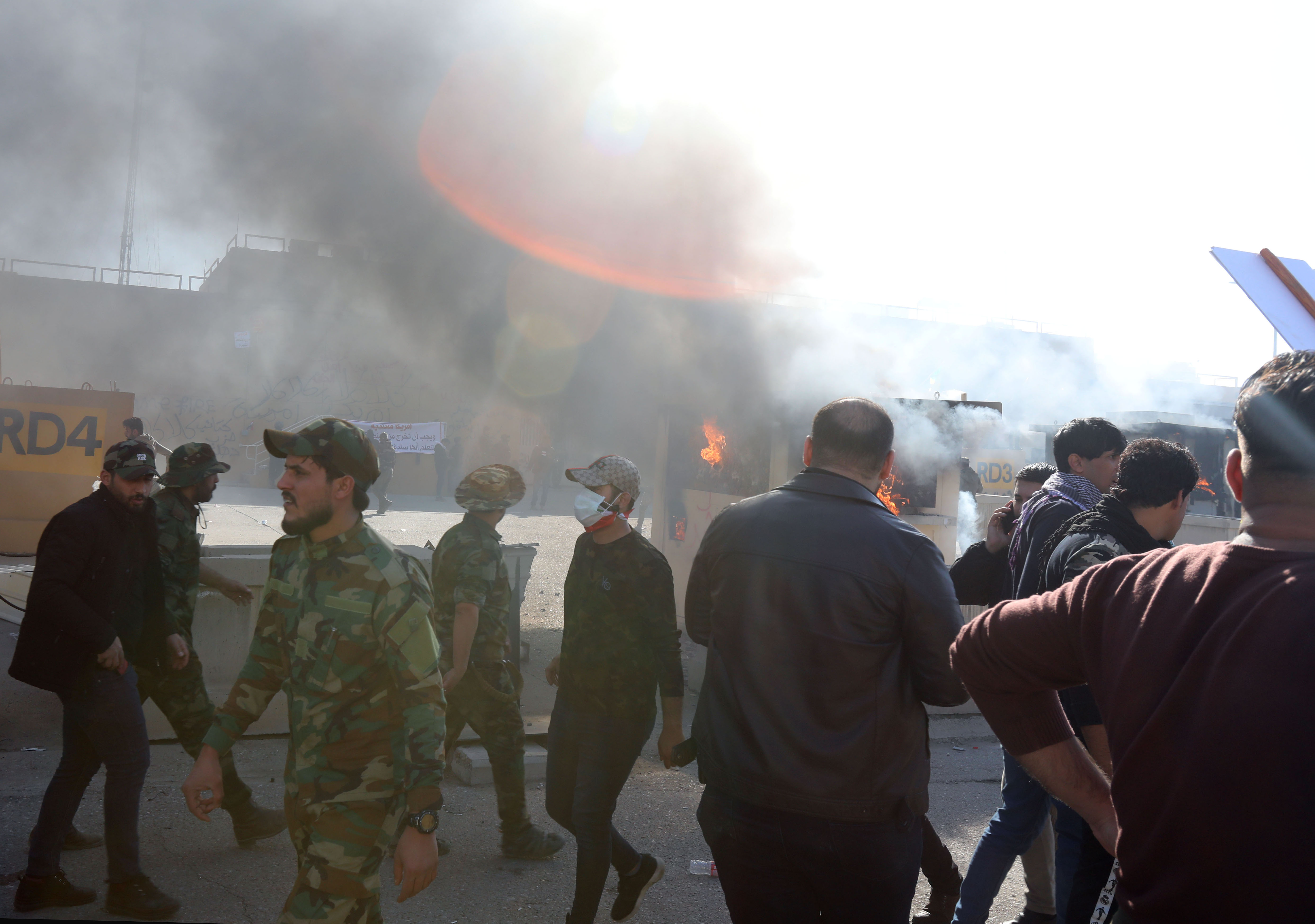 2019年12月31日在伊拉克巴格达美国驻伊拉克大使馆外拍摄的示威者点燃一间保安室。数百名示威者当天在美国驻伊拉克大使馆前集会,抗议美军空袭伊拉克。(新华社发,哈利勒·达伍德摄)