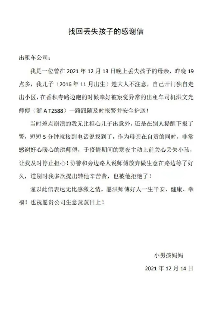 14日,孩子妈妈专门给出租车公司送去了感谢信:“我是一位曾在2021年12月13日晚上丢失孩子的母亲……非常感谢好心暖心的洪师傅,于疫情期间的寒夜主动上前关心。”