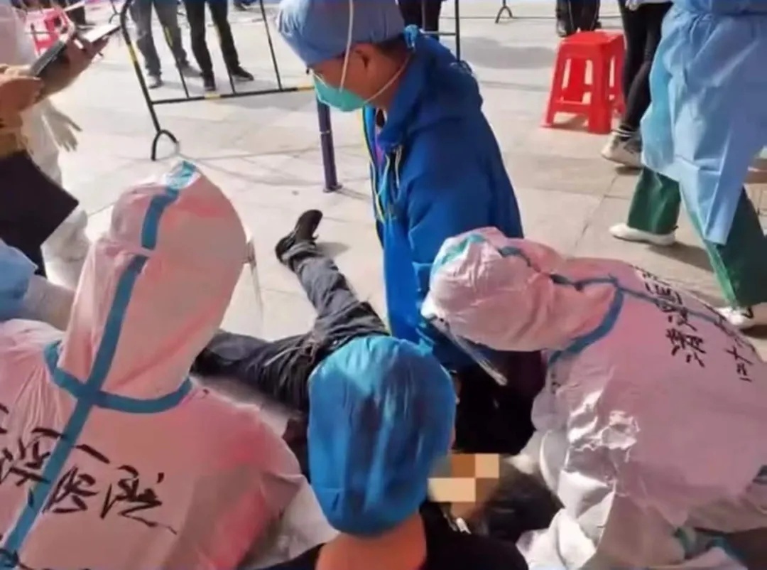 广东东莞一男子进行核酸检测时突然倒地、心跳骤停,采样医护莫志宁对他进行心肺复苏,待男子恢复意识后将他转送就医。