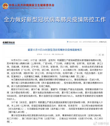 截至12月19日24时,据31个省(自治区、直辖市)和新疆生产建设兵团报告,现有确诊病例1736例(其中重症病例5例),累计治愈出院病例94014例,累计死亡病例4636例,累计报告确诊病例100386例,现有疑似病例4例。累计追踪到密切接触者1386785人,尚在医学观察的密切接触者51931人。