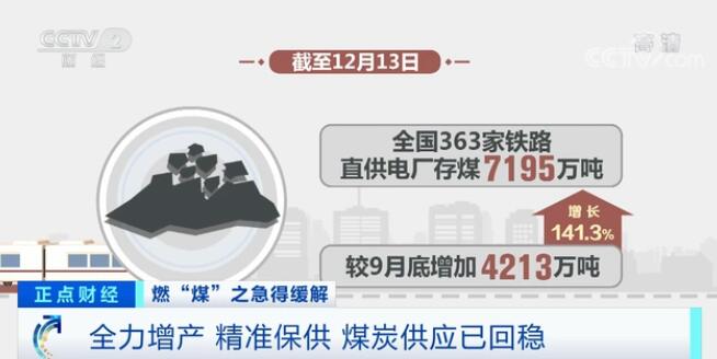 截至12月13日,全国363家铁路直供电厂存煤7195万吨,较9月底增加4213万吨,增长141.3%,平均可耗天数达25.5天,较9月底增长11.5天。
