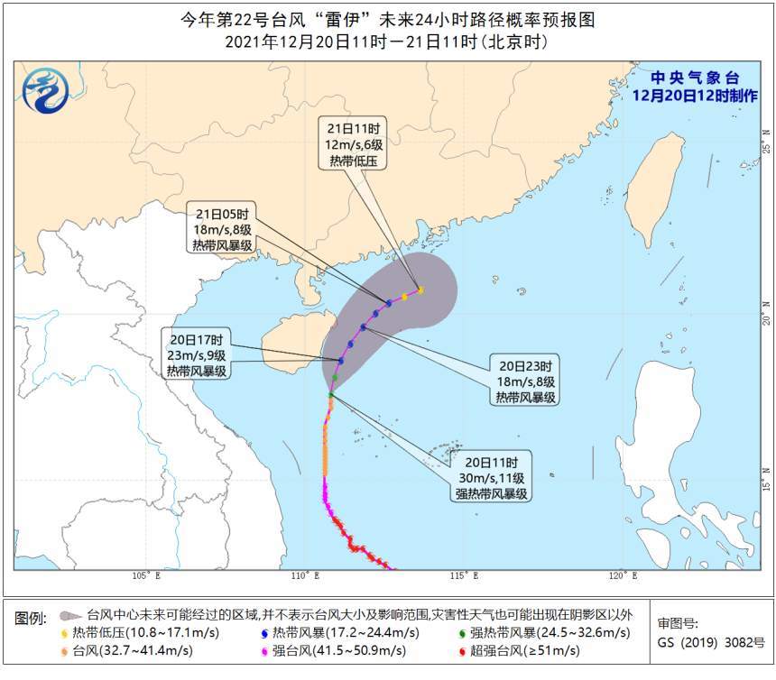 预计“雷伊”将以每小时20-25公里的速度向北偏东方向移动,强度逐渐减弱,今天夜间在海南岛东部海面转向东北方向移动,并于21日傍晚在南海北部海面减弱消散。