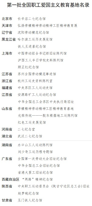 第一批全国职工爱国主义教育基地包括北京市长辛店二七纪念馆、黑龙江省铁人王进喜纪念馆、上海市中国劳动组合书记部旧址陈列馆、广东省全国第一次劳动大会旧址纪念馆、陕西省中央职工运动委员会(陕甘宁边区总工会)旧址等27家单位。旨在进一步加强红色工运资源的保护挖掘和宣传利用,引领各级工会努力把红色工运资源建设成为开展党史学习教育的重要阵地,打造成爱国主义教育、革命传统教育、加强职工思想政治引领的生动课堂,团结引导广大职工群众更好传承红色基因、赓续红色血脉、汲取奋进力量。第一批全国职工爱国主义教育基地在中国工运史上影响重大,代表性强、知名度高,现有的设施建设和保护利用较好,符合时代要求,具有较强的示范引领作用。