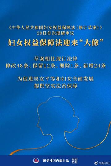 【权威快报|#妇女权益保障法迎来大修#】20日,妇女权益保障法修订草案首次提请全国人大常委会会议审议,这是妇女权益保障法施行近30年来又一次进行“大修”。与现行法律相比,#修订草案明确就业性别歧视主要情形#,规定学校和用人单位对性骚扰应当采取的预防和制止措施,增加对农村妇女土地及相关权益保护措施以及基层政府责任规定等。(记者白阳、任沁沁、齐琪,海报设计杨轶群)