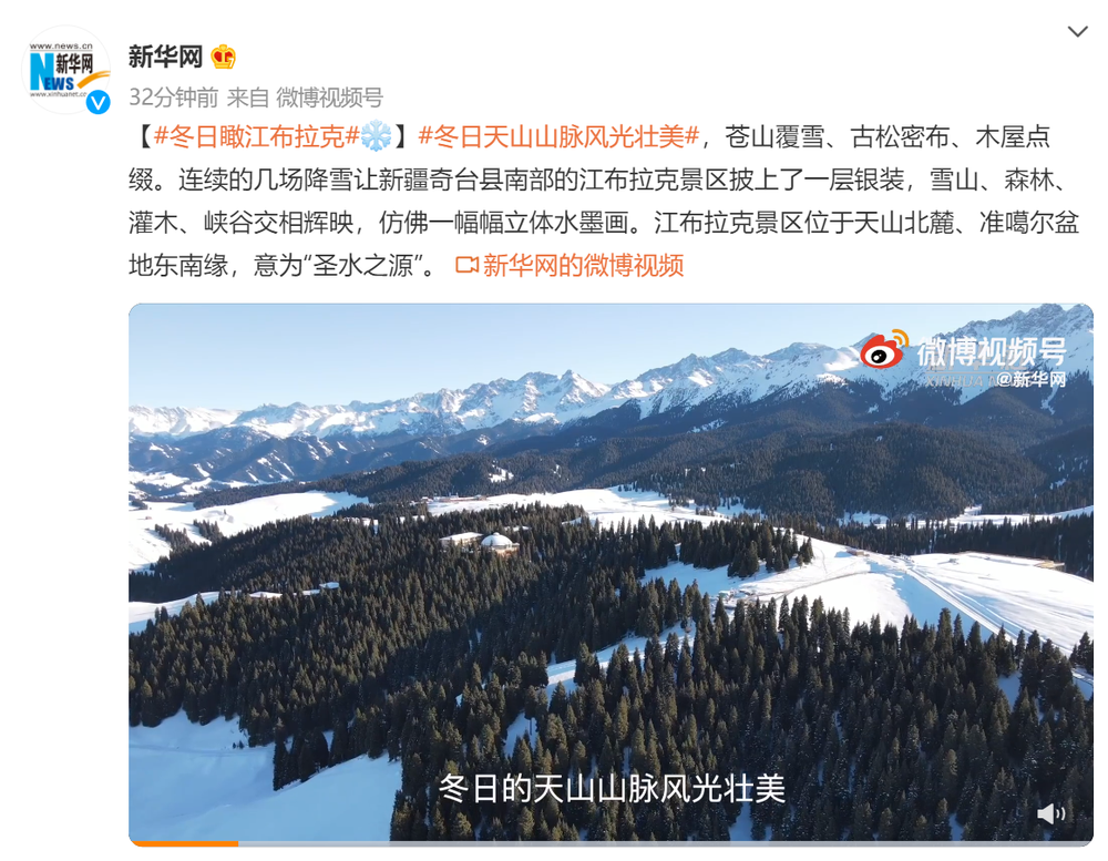 连续的几场降雪让新疆奇台县南部的江布拉克景区披上了一层银装,雪山、森林、灌木、峡谷交相辉映,仿佛一幅幅立体水墨画。
